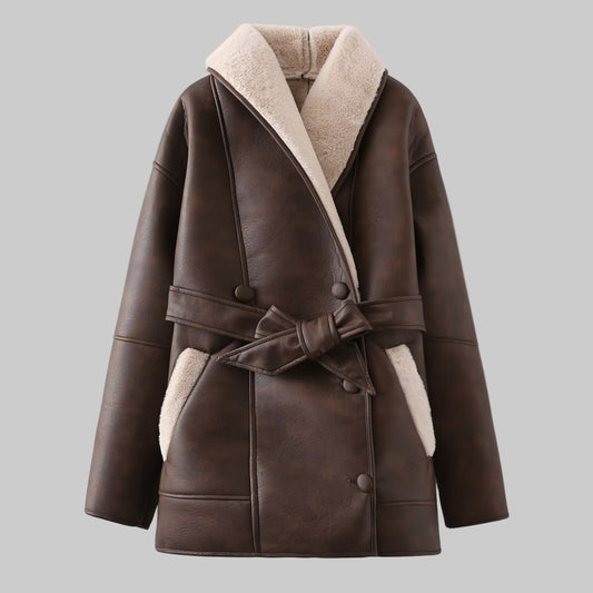 Manteau Élégance Cachemire en Cuir avec Col en Fourrure et Ceinture