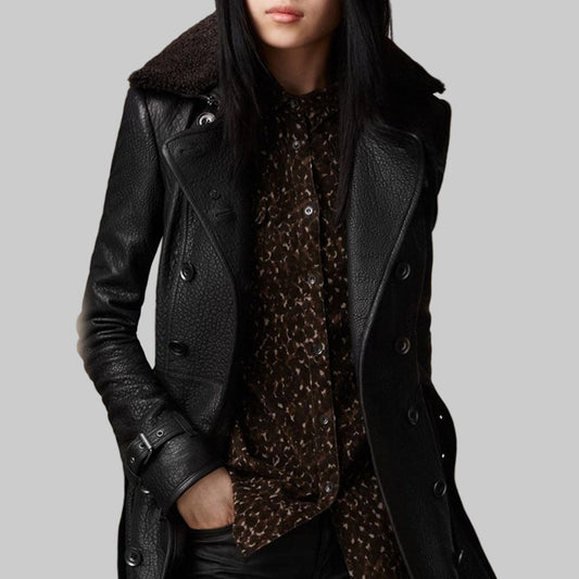 Manteau Élégance Cachemire en Cuir avec Col en Fourrure et Ceinture