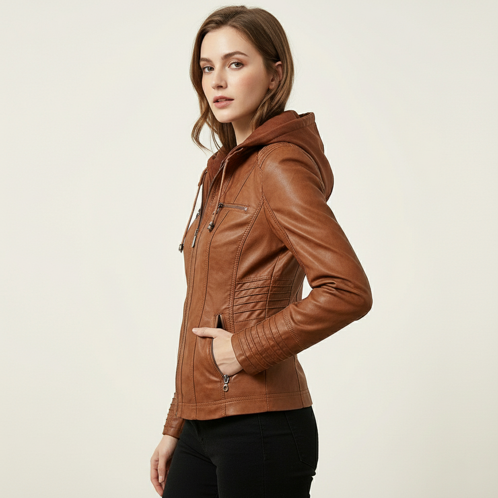 La veste Clara allie élégance et confort grâce à son matériau en PU. Sa capuche amovible et sa coupe moderne en font un choix polyvalent, parfait pour un look casual ou chic, idéal pour l’automne et l’hiver.
