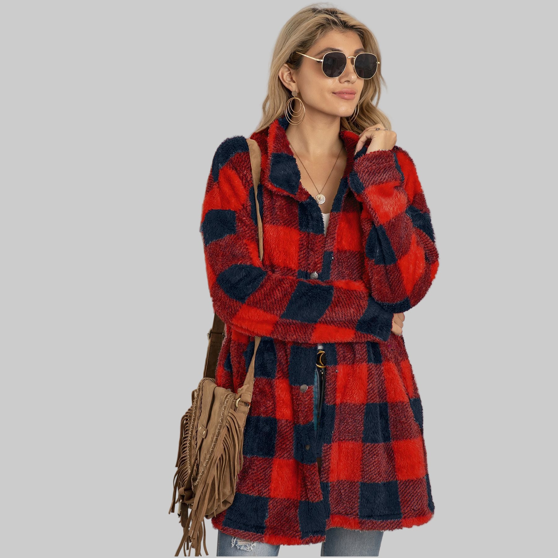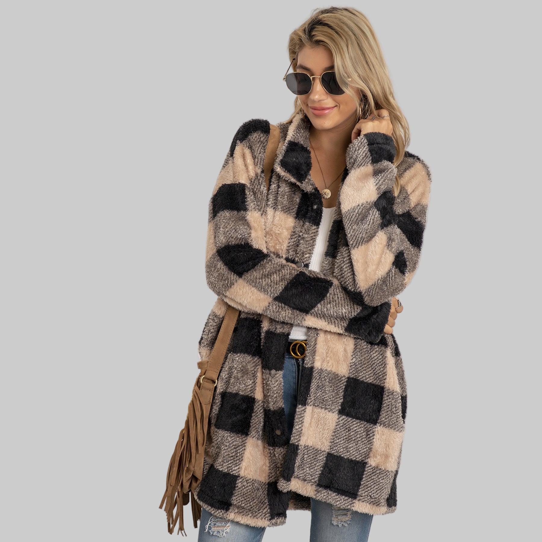 Transformez votre look hivernal avec cette veste longue en polaire à carreaux colorblock !